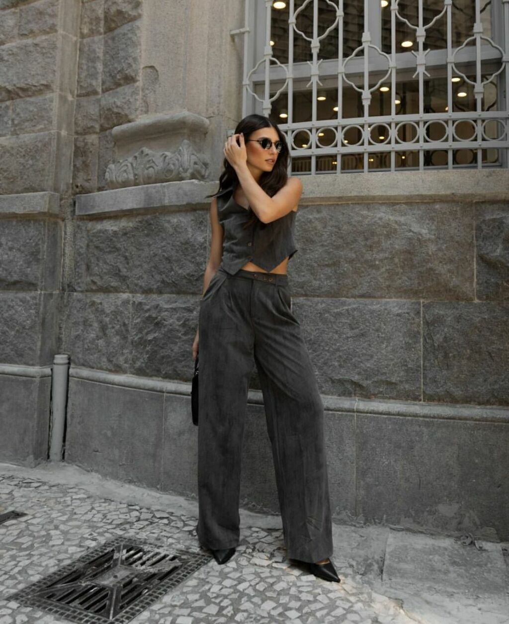 A calça alfaiataria marmorizada é a escolha perfeita para quem busca elegância com um toque moderno. Em cinza mescla, traz detalhes exclusivos em botões de madeira que realçam seu charme natural.